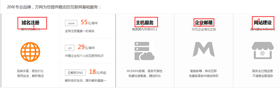 萬(wàn)網(wǎng)包括域名注冊(cè)、主機(jī)服務(wù)、企業(yè)郵箱、網(wǎng)站建設(shè)4部分。