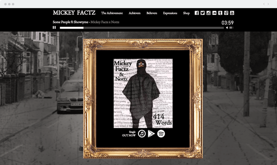 前面說(shuō)到了視頻背景/動(dòng)畫(huà)對(duì)于網(wǎng)站的作用。如果你是音樂(lè)家,為什么不向人們展示一下你的音樂(lè)才華呢?Mickey Factz就在自己的網(wǎng)站頁(yè)眉中加入了他的音樂(lè),很有創(chuàng)意。
