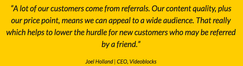 制作一支原生影片所使用到的素材可能會非常昂貴,但是Video Block 顛覆了業(yè)界的常規(guī),它提供影片素材,從短片、背景、特殊效果、甚至到AfterEffects 范本等,不論每個月下載多少內(nèi)容,都均一收費,但現(xiàn)在Referral Program 并沒有直接在網(wǎng)站上揭露。不過根據(jù) Video Block 的 CEO 的引言,推薦營銷的策略的確讓他們更不費力地招來更多許多新客戶,而 Refferral Candy 的個案研究也顯示出 Video Blocks 透過推薦營銷賺進(jìn) 10 萬美元。