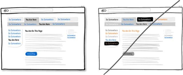 應(yīng)用視覺(jué)元素之手法可以幫助使用者了解頁(yè)面上的功能與結(jié)構(gòu),例如顏色、深度與對(duì)比度等。同時(shí)為了與你的使用者精準(zhǔn)的溝通,需點(diǎn)擊的行為(如連結(jié)或按鈕)與需選擇的元件(如選單)設(shè)計(jì)上要有所區(qū)別,同時(shí)上方的文字必須描述清楚,才有利使用者辨別。在底下的例子中,作者選擇了藍(lán)色做為網(wǎng)站上使用者可點(diǎn)擊元件的主色,而黑色為標(biāo)示已選擇的項(xiàng)目或是現(xiàn)在頁(yè)面的名稱(chēng),簡(jiǎn)單明顯的顏色應(yīng)用,讓使用者藉由顏色的線索更輕易的學(xué)習(xí)和使用網(wǎng)站功能。最后請(qǐng)記得,千萬(wàn)別使用難以辨識(shí)或過(guò)多的顏色混淆使用者。