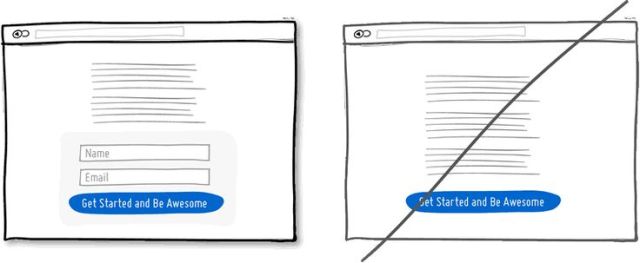 當(dāng)頁(yè)面上有一些我們期望使用者做,并會(huì)帶來(lái)價(jià)值的功能時(shí)(例如留下聯(lián)絡(luò)方式),最好可將實(shí)際的表單或欄位放置于本頁(yè)上。如下圖,欄位若能與頁(yè)面整合在同一層,其帶來(lái)的好處大于還要連結(jié)至別頁(yè)輸入的方式。